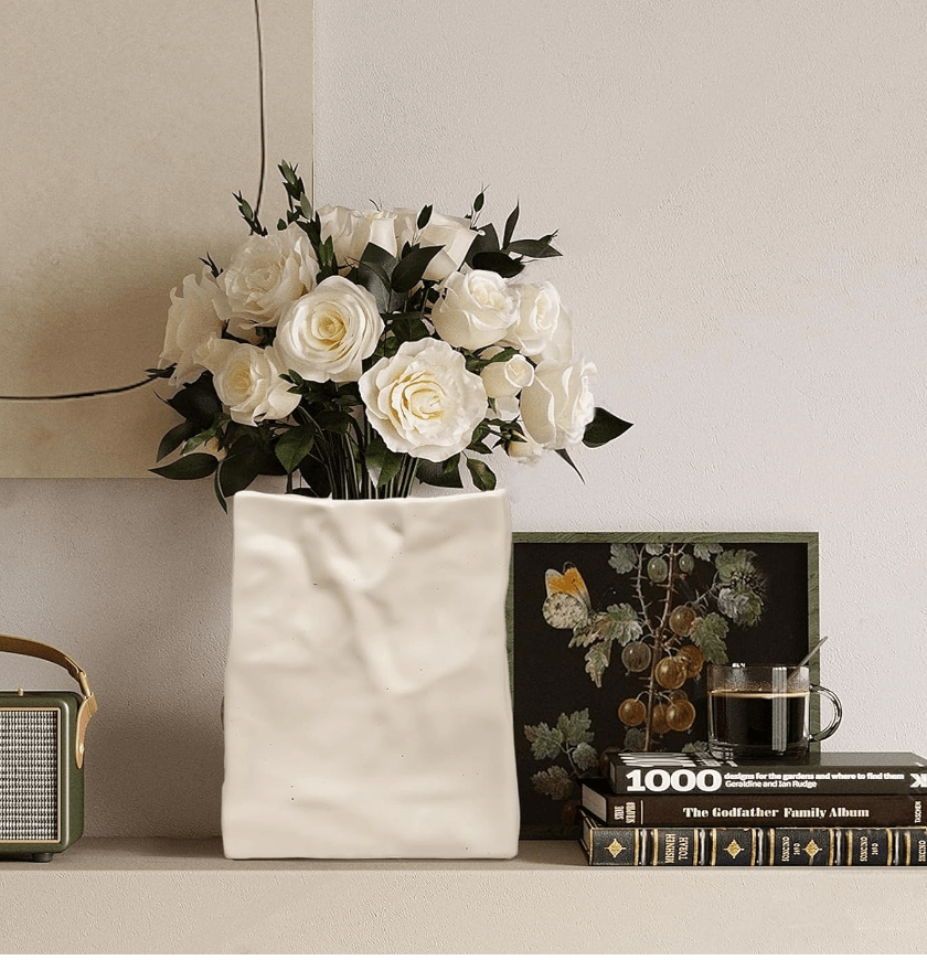 If you enjoy the look of a ceramic vase that can always be on display, but simply can’t embrace the bow trend, this ceramic paper bag vase is also a fun option for an original vase with less frills.